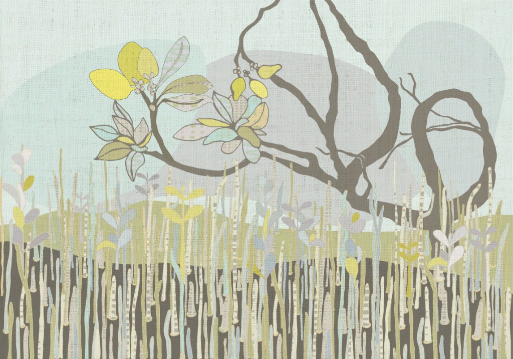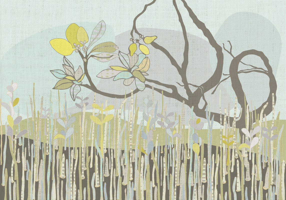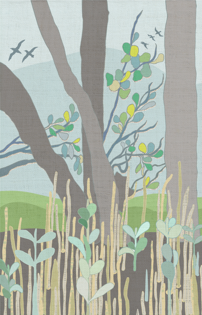 My work will be printed on linen and there will be two pieces, both 1.4 x 2m. The work was inspired by a couple of fun kayaking trips through the Mangroves at Barwon Heads in Victoria with all the artists in 2019 and 2020. Despite getting pretty wet in my leaky kid-size kayak on my first trip I went back for more. On the next trip in a grown-up sized kayak I managed to take lots of photos which helped me decide how I wanted to represent what I’d seen. It’s such a unique ecosystem down there in the Mangroves. I had no idea the Barwon Heads Mangroves were there until I became involved in this project. In my early twenties I spent some time on Lizard Island in far north Queensland and also on the mainland and was fascinated by these murky mysterious landscapes that came and went with the tide. I’d always associated Mangroves with a tropical climate so it was exciting to find that we had our own cold climate Mangroves very close to home.